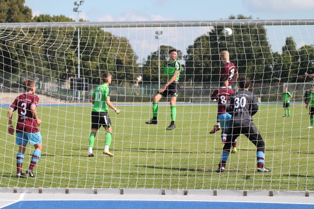 IMG_4129-min ← Vorheriges Nächstes → Julian Karnowka gewinnt das Kopfballduell gegen den Leipziger Stürmer; Berkant Icier, Niklas Schade und Jannik Kleim brauchen nicht einzugreifenTeilen
